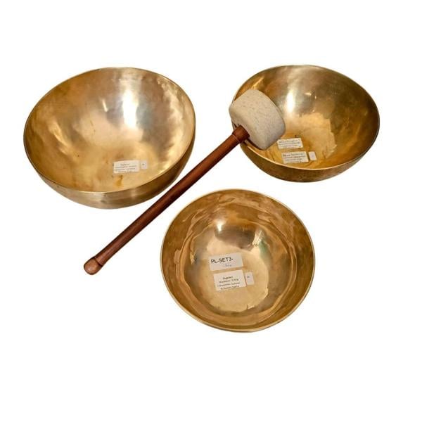 Jede Schale in diesem Set ist ein handgemachtes Original, das Set ist also einmalig und kann nur als Ganzes erworben werden.Folgende ausgesuchte Klangschalen lassen das Set schön erklingen: